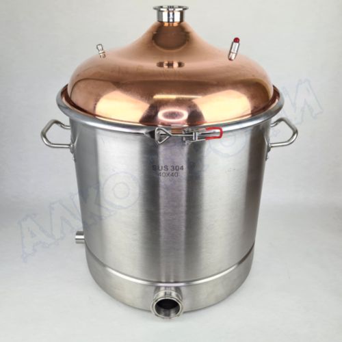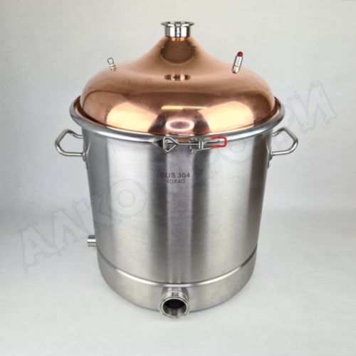 Перегонный куб из пищевой нержавеющей стали AISI 304 кастрюльного типа с крышкой из меди отечественного производства. Используется с дистилляторами (самогонными аппаратами) в качестве емкости нагрева спиртосодержащих жидкостей.