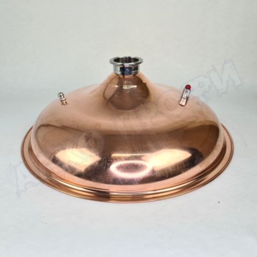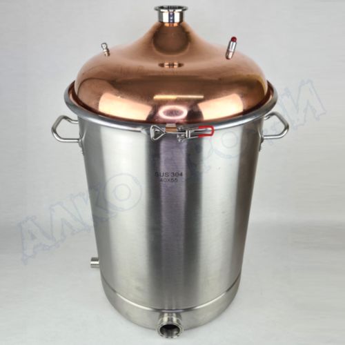 Перегонный куб из пищевой нержавеющей стали AISI 304 кастрюльного типа с крышкой из меди отечественного производства. Используется с дистилляторами (самогонными аппаратами) в качестве емкости нагрева спиртосодержащих жидкостей.