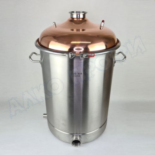 Перегонный куб из пищевой нержавеющей стали AISI 304 кастрюльного типа с крышкой из меди отечественного производства. Используется с дистилляторами (самогонными аппаратами) в качестве емкости нагрева спиртосодержащих жидкостей.