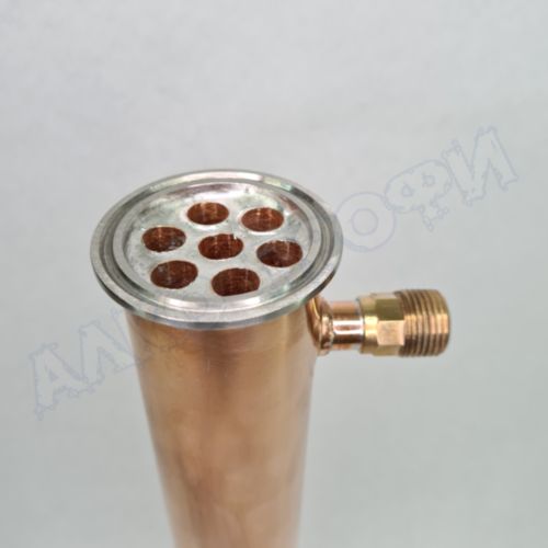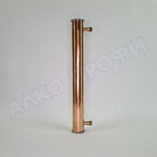 Холодильник медный 2" 400мм Д54 НР1/2 - Кожухотрубный проточный холодильник служит для охлаждения больших объёмов пара и флегмы. Способен утилизировать большие подаваемые мощности, благодаря чему может быть использован и как холодильник и как дефлегматор. В режиме работы как холодильник охлаждает продукт самогоноварения. В режиме дефлегматора охлаждает флегму для её последующего отбора, дистилляции и ректификации. Медь отлично абсорбирует сернистые соединения и придаёт мягкость напитку.
